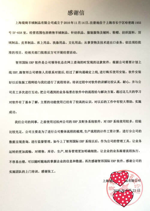 上海缇绮羊绒制品有限公司向智邦国际送感谢信