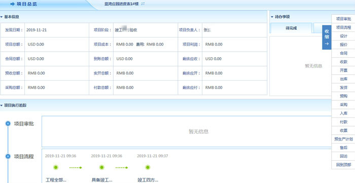 一、在系统中,支持企业在一个界面把控项目全流程,从发现日期、项目阶段、总额、付款总额等基本信息到项目执行进度追踪,助力企业实时查看和项目相关的所有单据各个环节执行情况,让项目进展一目了然。同时,还可进行报价添加、合同添加等操作,助力业务人员一键执行关联任务,避免来回切换,节省时间与精力,让执行操作更加灵捷高效。此外,项目总览界面还为企业提供了待办事项提醒功能,管理层可督办和项目相关的工作及查看历史已完成的工作,一键直达目标单据,一个界面透视呈现项目各个阶段进展,一体化智能掌控项目周期全过程。
