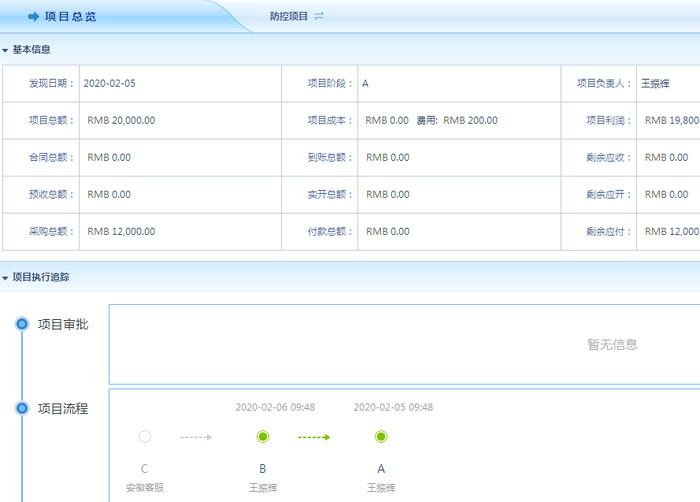 一、在系统销售栏目包含了客户、项目、报价、合同、售后等环节,其中项目环节支持企业线上一键添加项目,或是由客户、日程等直接生成项目,提高业务人员录入项目效率。同时,在项目总览环节,支持企业在一个界面即可实时查看从投资决策开始阶段到项目进度,再到项目结束等全流程,避免出现以往的纸质单据来回传递以及多个界面来回切换等情况的出现,助力企业智能化把控从初步接洽跟进、招投标、报价、签订合同、采购、出入库、收付款、生产、售后回访等全环节。